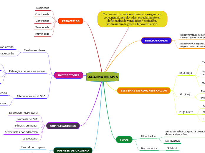 OXIGENOTERAPIA MEDINA LO - Mapa Mental. Oxigenoterapia a administração de oxigênio medicinal através de via inalatória com finalidade terapêutica de prevenir ou melhorar a hipóxia tecidual mantendo no ar inspirado uma concentração de gás capaz de oxigenar adequadamente o sangue que sai dos pulmões. Generalmente la pauta un médico pero los enfermeros estamos capacitados para valorar si un paciente necesita.